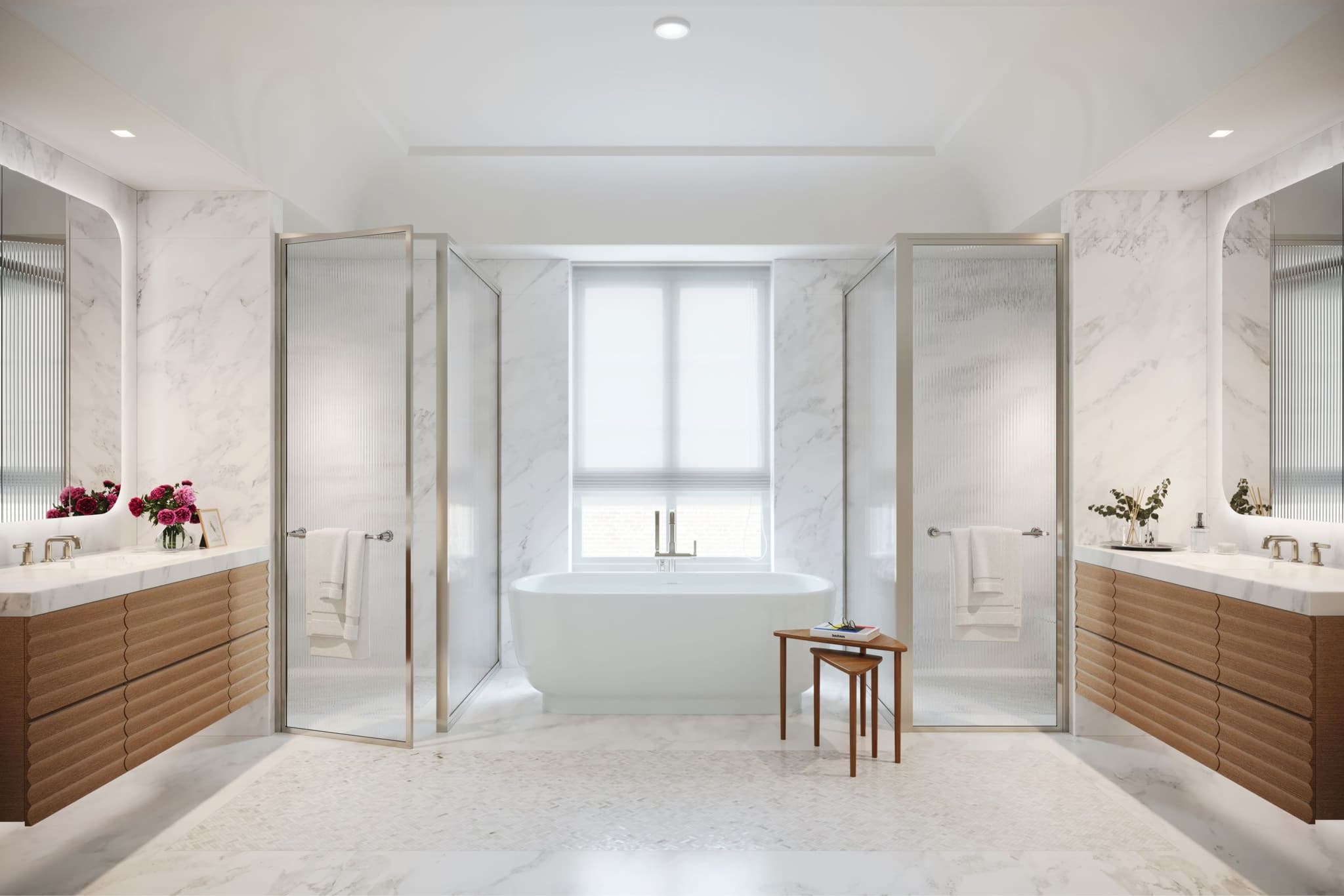 Across the full-floor residences, the primary suite is a world unto itself. At the heart of this private wing is a bedroom located on the building’s western facade, off the avenue, assuring maximum tranquility and preserved views. The accompanying large bath embodies a keen awareness of space, storage, and ceremony, while selected materials and subtle architectural details in both rooms integrate this special haven into the Sixteen Fifth Avenue experience.
