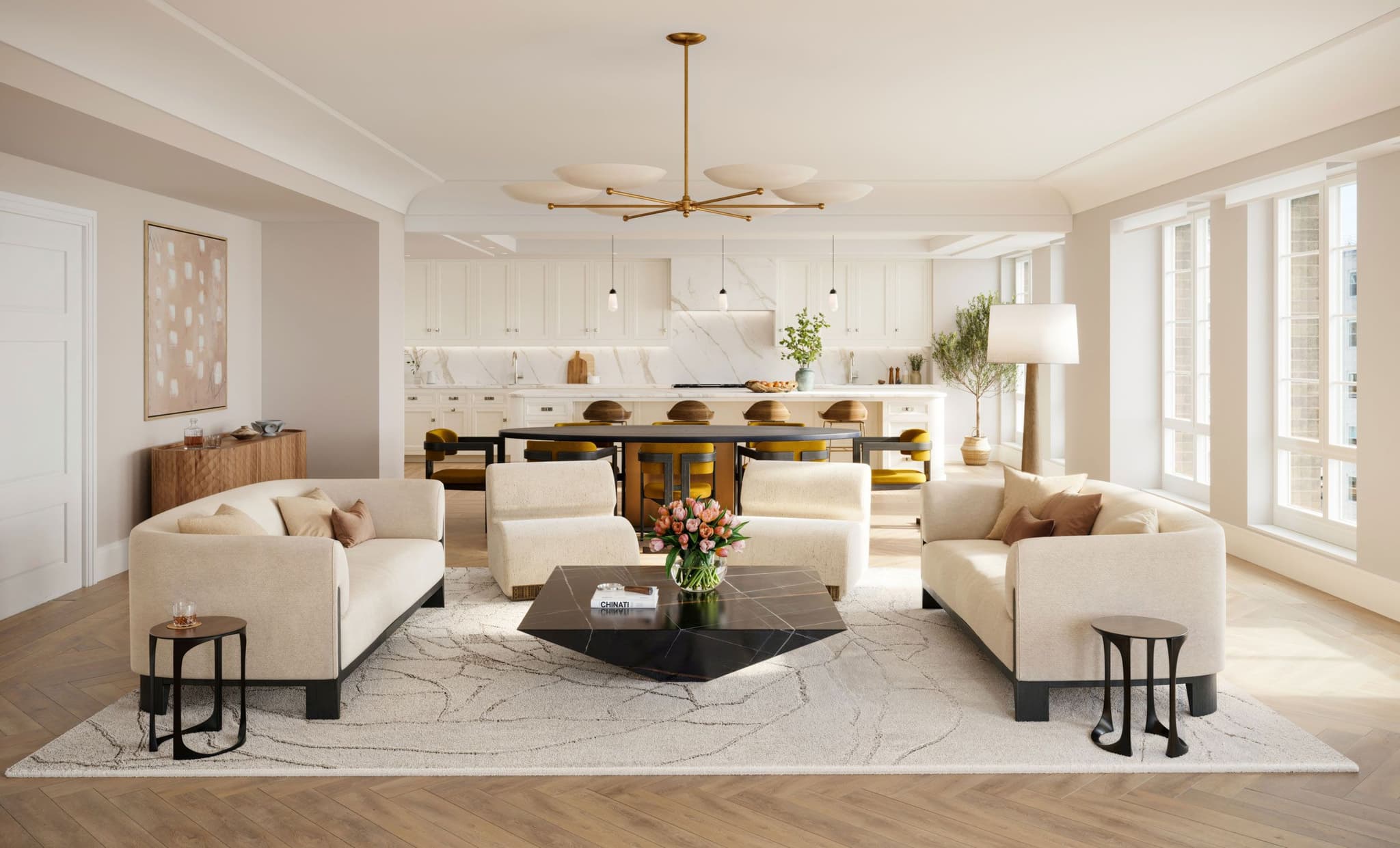 Of the 12 full-floor residences at Sixteen Fifth Avenue, eight evoke the artist lofts of Greenwich Village while catering to contemporary modes of living. Each of these homes features an expansive kitchen that flows seamlessly into the great room—an ideal configuration for both culinary enthusiasts and casual entertainers. The great room can be further customized by choosing one of four layouts.