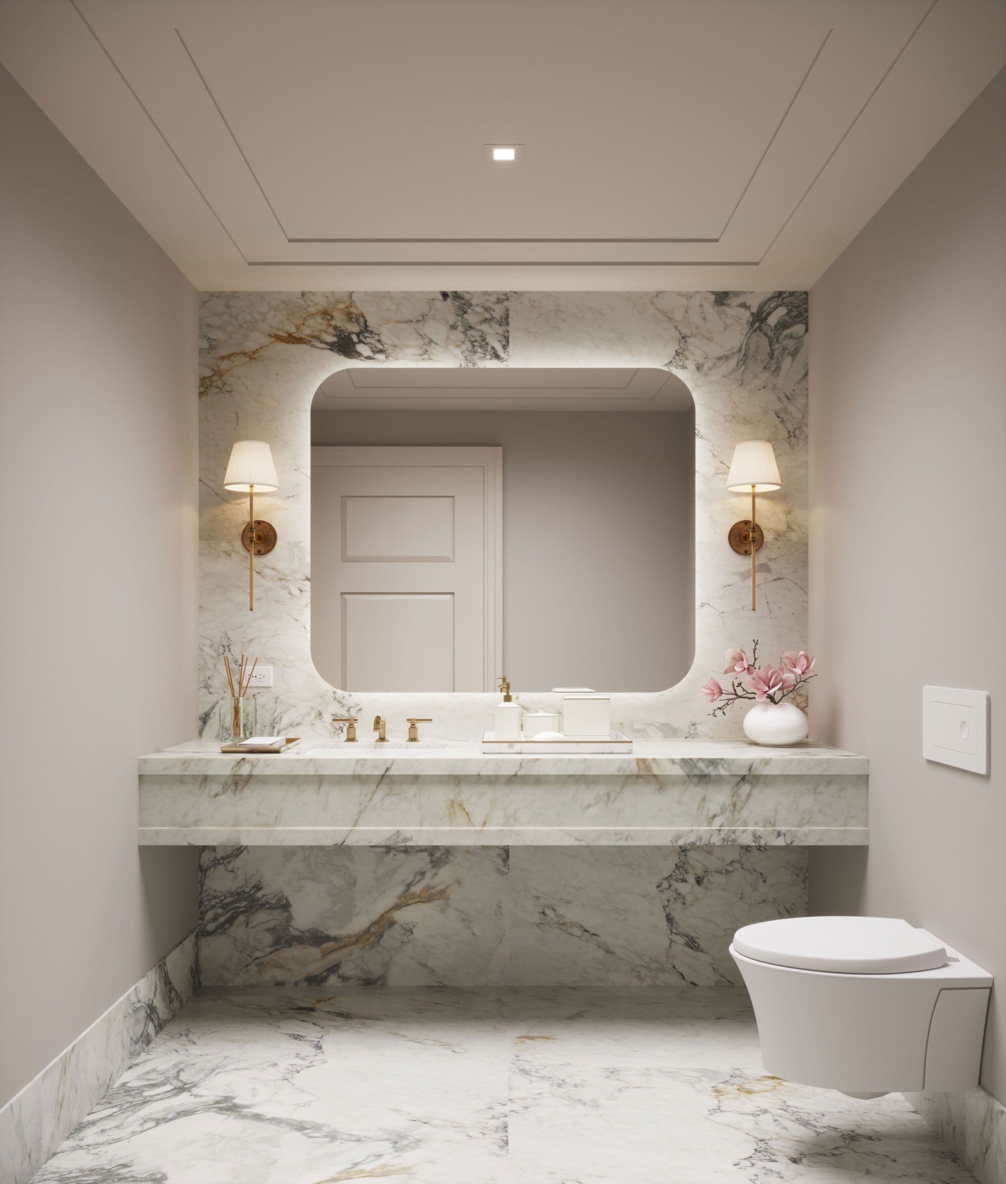 CALACATTA VISION HONED MARBLE WALLS AND FLOORS WITH A MOSAIC INLAY
