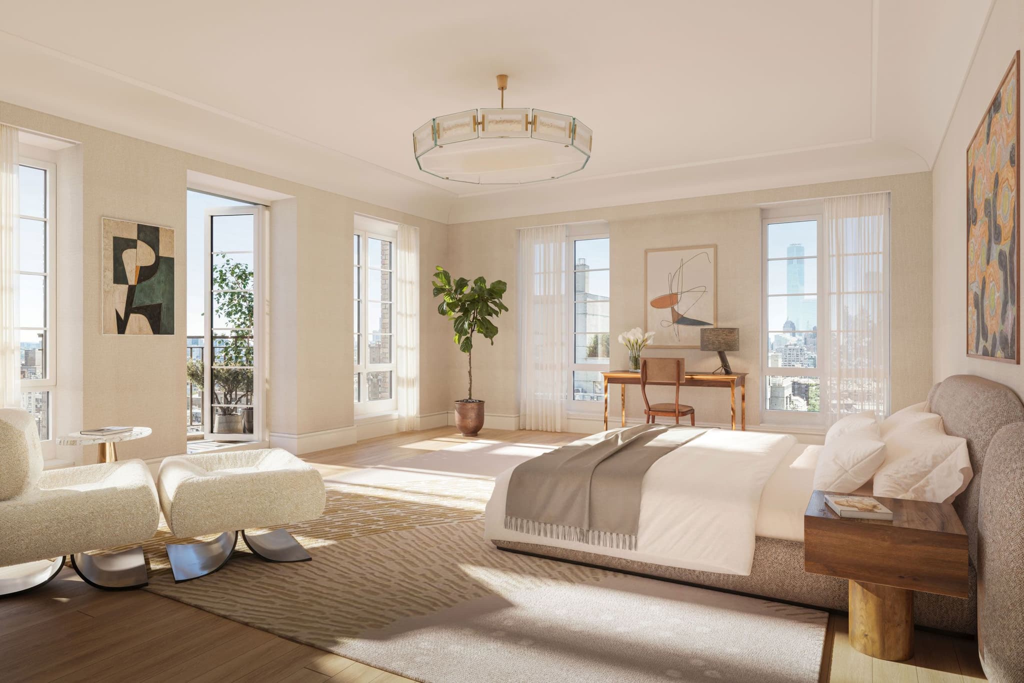 Penthouses comprise five bedrooms, each of which includes an en-suite bath. The primary suite quintessentially captures Robert A.M. Stern Architects’ understanding of the bedroom as a haven within the city. Perched high above Fifth Avenue, the primary suite includes dual dressing rooms as well as bathrooms, in addition to an outdoor terrace or Juliet balcony. Indoor-outdoor connectivity and the sheer volume of space set the primary suite apart as something genuinely covetable.