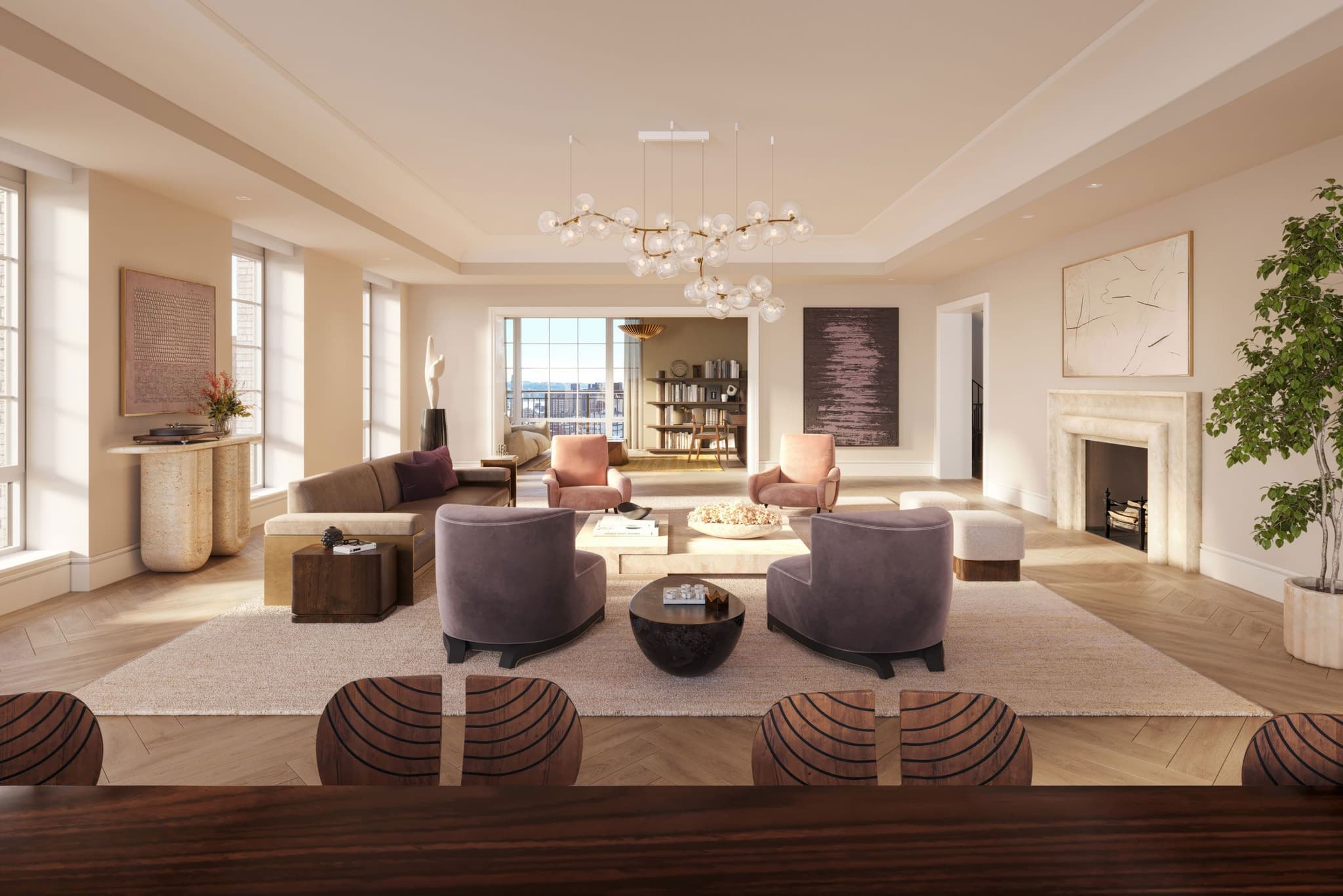Robert A.M. Stern Architects’ treatment of the penthouses as townhouses in the sky is immediately apparent upon entry to both residences. These duplex and triplex homes open to a stair-ringed foyer, which graciously leads to a great room that enjoys two exposures—one to the south for optimal daylight and the other to the east for picturesque Fifth Avenue views. Curated materials and carefully detailed millwork underscore the quality with which the firm has approached each residence’s overall design.